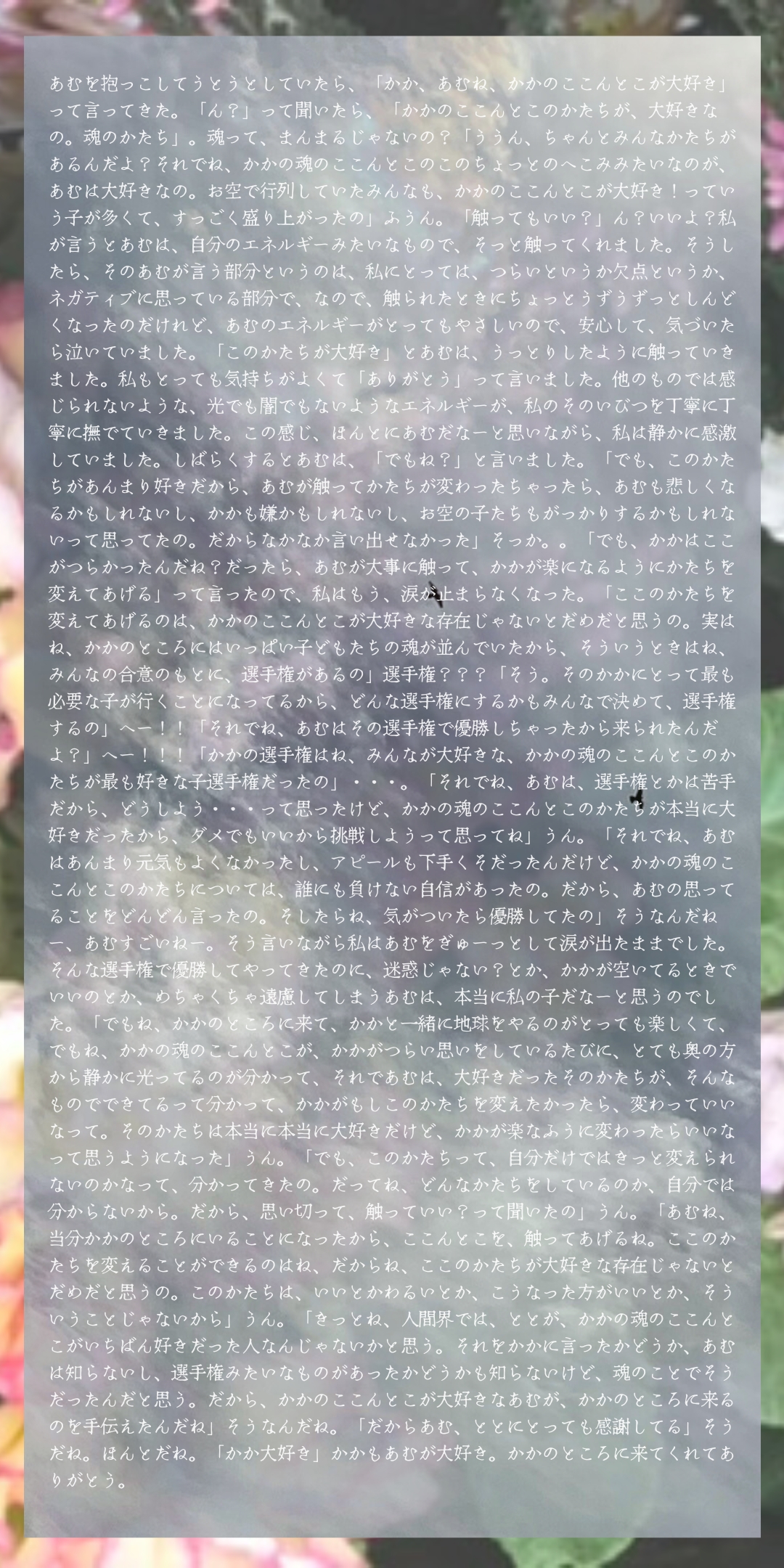 n* 生まれるとしたら?生まれる? n* 生まれるとしたらね!(キラキラ) n* うん、生まれるとしたらね? n* 男の子がいいか女の子がいいか、ずっと考えてるんだけど、決まらないの n* そうね、あむは「今のところ」性別がないけど、地球に来ると身体ができて、「今のところ」身体には性別があるからね? n* うん、それはいいの。それでね、どっちかでどっちかじゃないといけないなら、どっちかなって n* はい n* それをカードに聞いて? n* あむが好きな方でいいのよ? n* うん、でも決まらないから、かかが一緒に決めて? n* 決めるのはあむがいいよ? n* じゃあ、かかも一緒にカードみて? n* うん、それならいいよ? * n* じゃあね、あむが男の子と女の子とについてそれぞれどう考えてるか出そうね? n* かかのも出して!かかの先に出して! n* あら。じゃあね、かかは、男性性と女性性について n* あ、あむもそれがいい! n* じゃあ、それも出して、男の子と女の子も出そうね? n* うん n* かかは、そもそもの男性性と女性性が、どんな感じのものなのかを出します n* そもそもの?もともとの? n* うん、そうね、「元々の」っていうのは、はじめはそうだった、そうやって始まったって意味ね? n* うん n* 「そもそもの」っていうのは、本来そうだったらいいなって思われてた、っていうような感じかな n* そっか n* よろしいですか? n* うん n* では出します。(男性性=39マニ・ラトナ・ムドラ「全てを癒す」、女性性=11アディ・ムドラ「静止する」どちらも正位置)ほー。男性性の方が全てを癒す、女性性は静かにするって出たね n* 癒すって、あむは、困っているところを、心とか動いてとかで耕す、みたいに思うから、大きくみるとそうなのかも? n* なるほど。そういうものを自分自身で引き受けて解消しようとするからってことね。個人個人ではそう見えなくても、社会的にはそう思いますね。人間は社会的な動物だからね。そういう困ったものを解消するのは、必ずしも言葉ではないので、心とか動いてとかでいいと思う n* うん。それでね、女の人はっていうか女性性は、その大変を静かにしてあげるの n* うんうん、そんなイメージでしょうね。男性性における静かと、女性性における静かの違いが分かるね n* うん。あむは静かなのが好き n* うんうん、最初からそうだもんね。地球の小さな小さな振動の音に、耳を澄ますのが好きだったもんね? n* うん。小さなのなら小さなのほど好き、いい音 n* そっか n* じゃあ、次はあむがどう感じてるか n* うん n* やってみよう。(男性性=9ジェシュタ・シャリーラ・ムドラ逆位置、女性性=35ヴァジュラプラダマ・ムドラ逆位置)どっちも逆位置だ。これは、うまく行ってないように見えてるってこと? n* うん、うーんとね、かかが出してくれたやつについて? n* そかそか。じゃあ、男性性のすべてを癒すっていうのが、上半身だけしか機能してないって? n* うんうん、身体の上の方でばっかりやってる感じ?上でばっかり頑張ってて大変そう n* あー、そうか。そうかも。じゃあ、女性性は? n* 信じるが足りないの、そうみえる n* 信じるが足りないの?不信感が漂ってるの? n* うん。それでね、みんな鬱なの n* 不信感からの鬱なのね n* そこが繋がってるようにみえるの n* そうかー、不信感があったら、静かにできないね n* うん、自分の中がわんわんしてる n* わんわん? n* うわーんうわーんって振動がうねってる感じの音がするの n* 女のひとの中で? n* 中というよりも?女のひとの身体自体が?ふあーん、しんじられなーいって、うわーんうわーんって。あのね、かかがよく「信じられない!」って、嬉しいときにビックリマークの代わりに言うでしょ? n* うん n* あの「信じられない」じゃないの、本当に信じられないの、何も誰も n* はー、そっか、同じ「信じられない」でも全然違うね! n* うん。全然違う、ほとんど反対 n* あらら。文字だけで伝わっちゃったら反対に伝わっちゃうね!?かかも文字だけで読んだら、不信感の方のことに聞こえる。初めて気がついたー! n* 文字はとってもエコだもんね?運ぶ情報のことでね?でも誤解が多いんだなぁって、かかについて他のひとから聞かれることで思ってたの。だから、かかに「あむは余計なことを言いたくない」って言ったの n* そっかそっか、あむが来たばっかりの頃に「あんまり話したくない」って言われたときから、かかちょっとあむのご希望をちゃんと分かってなかった。ごめんね?あむがかかのこと翻訳してくれてたね? n* そうしながら、うーんうーんって言葉について考えてたよ?伝わる、伝わらないってことも n* そっか、だからあむは、「子どもはすぐに大人にアドバイスするんじゃなくて、言葉を観察する時期が必要だと思う」って言ったんだね? n* うん。過去生とかお空の記憶を持ったまま来てる子が多くなって、そういう子は、すぐに言葉も、脳内じゃなく声で使えるし、「こうしたらいいよ、こうだよ」って言えちゃうことがあるんだけど、そうすると正規のルートで来